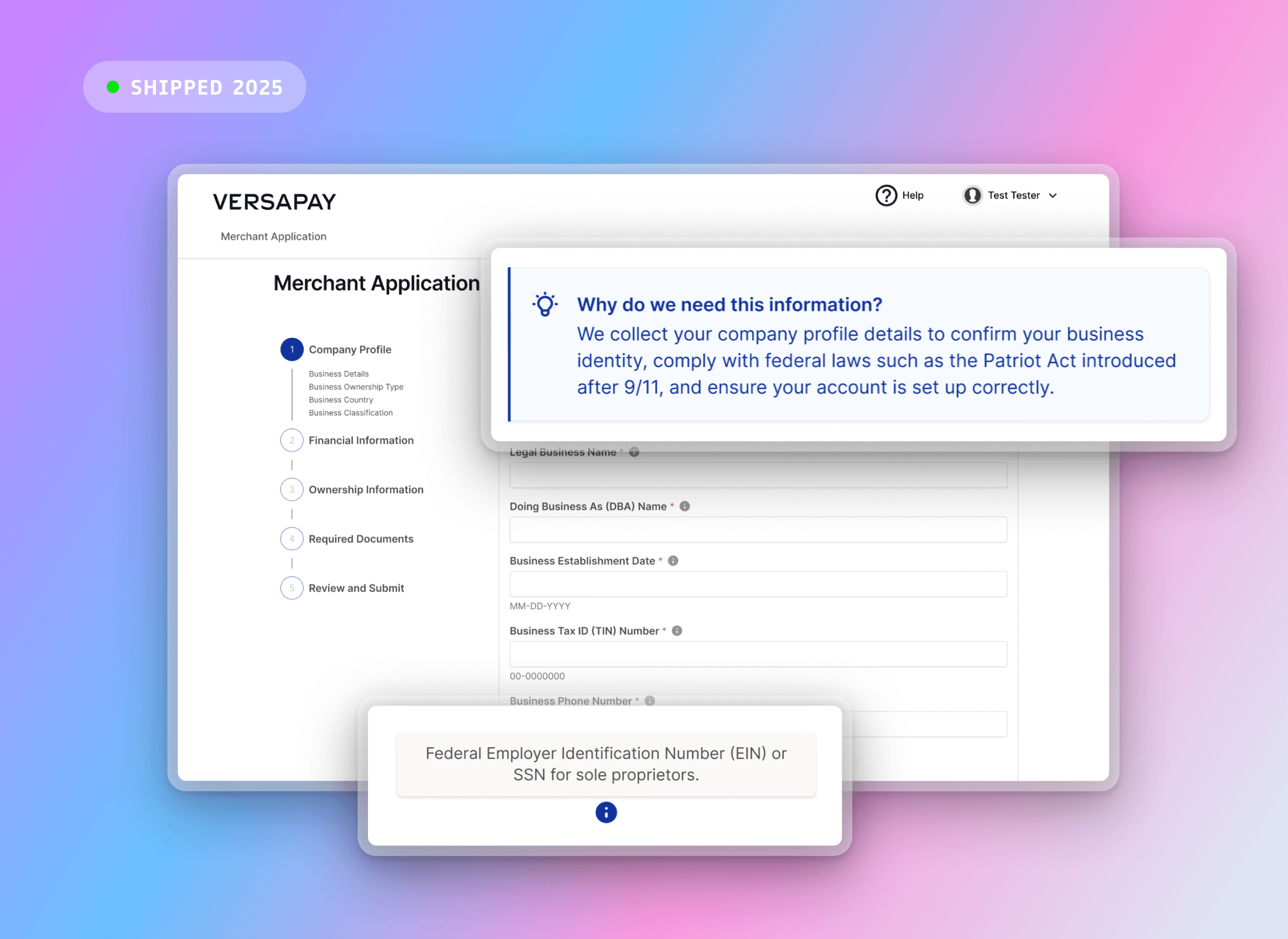 Designed the company’s first payment facilitator onboarding application to empower merchants to complete the process independently. Through clear content, tooltips, and a streamlined flow, we reduced reliance on support to enable completion in 20 minutes and approvals within 48 hours.