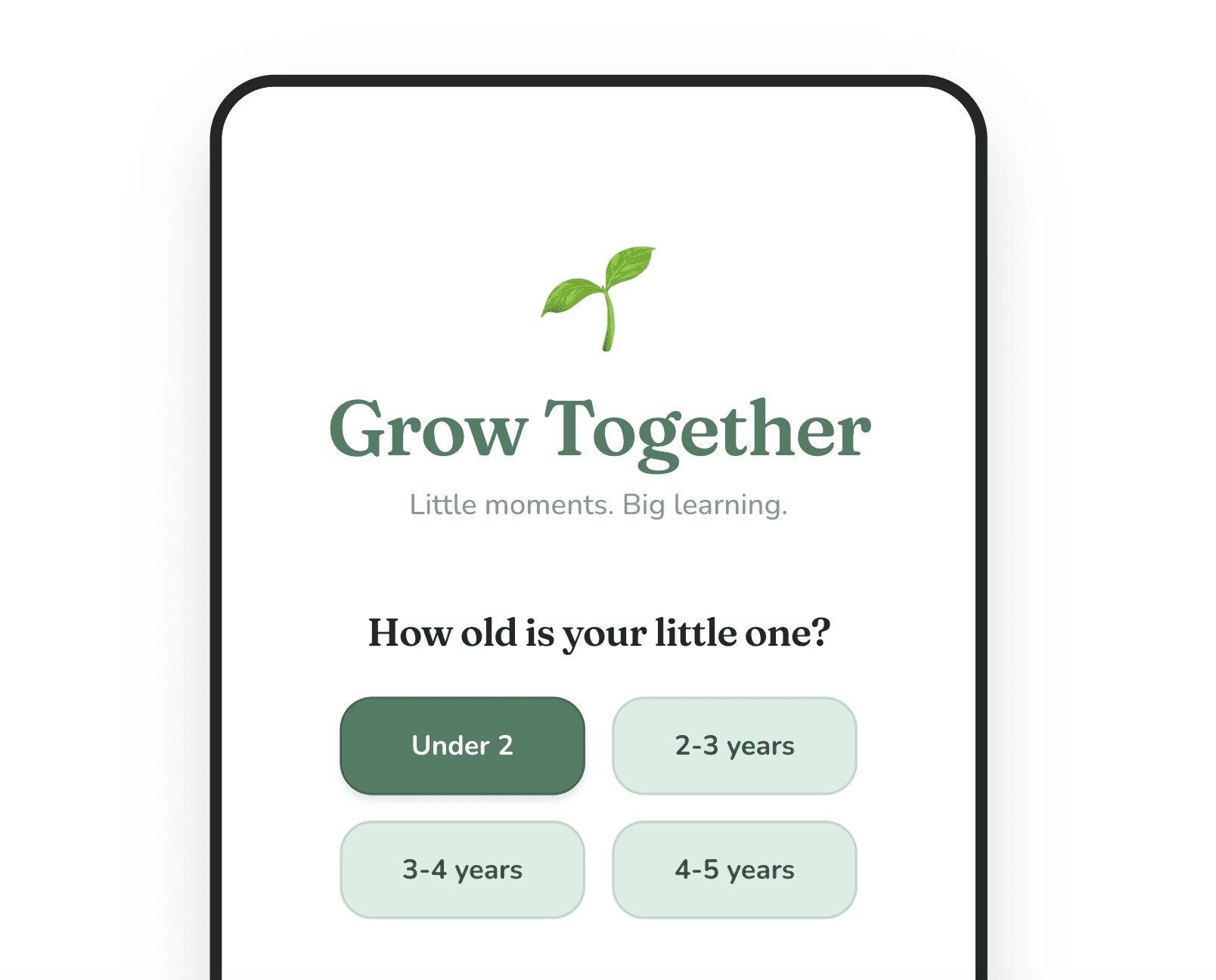 Grow Together is a mobile-first app designed to help busy parents of young children (ages 2–5) facilitate short, meaningful learning moments at home. The product focuses on low-effort, high-impact activities using everyday household items, removing barriers like cost, time, and preparation.