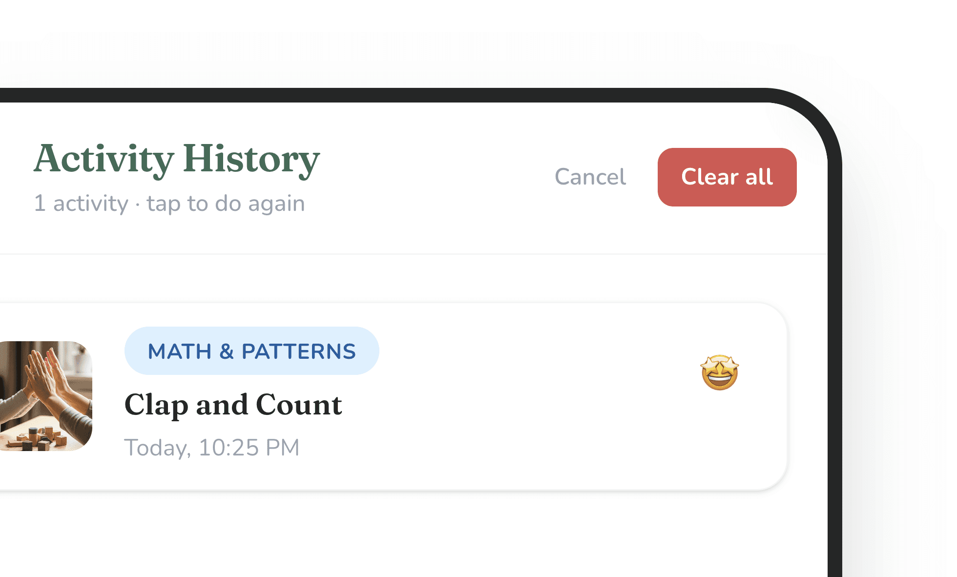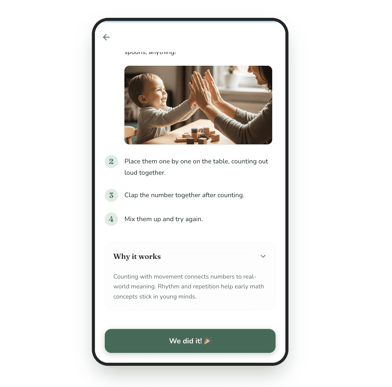 A lightweight mobile app designed *in four hours* to help busy parents turn everyday moments into meaningful learning experiences for their young children. With the eventual goal of removing barriers like time, cost, and complexity, this first pass concept delivers simple, research-informed activities that can be done at home in just a few minutes. The experience is intentionally minimal, enabling parents to engage quickly, feel confident in their role, and build consistent learning habits without added pressure.