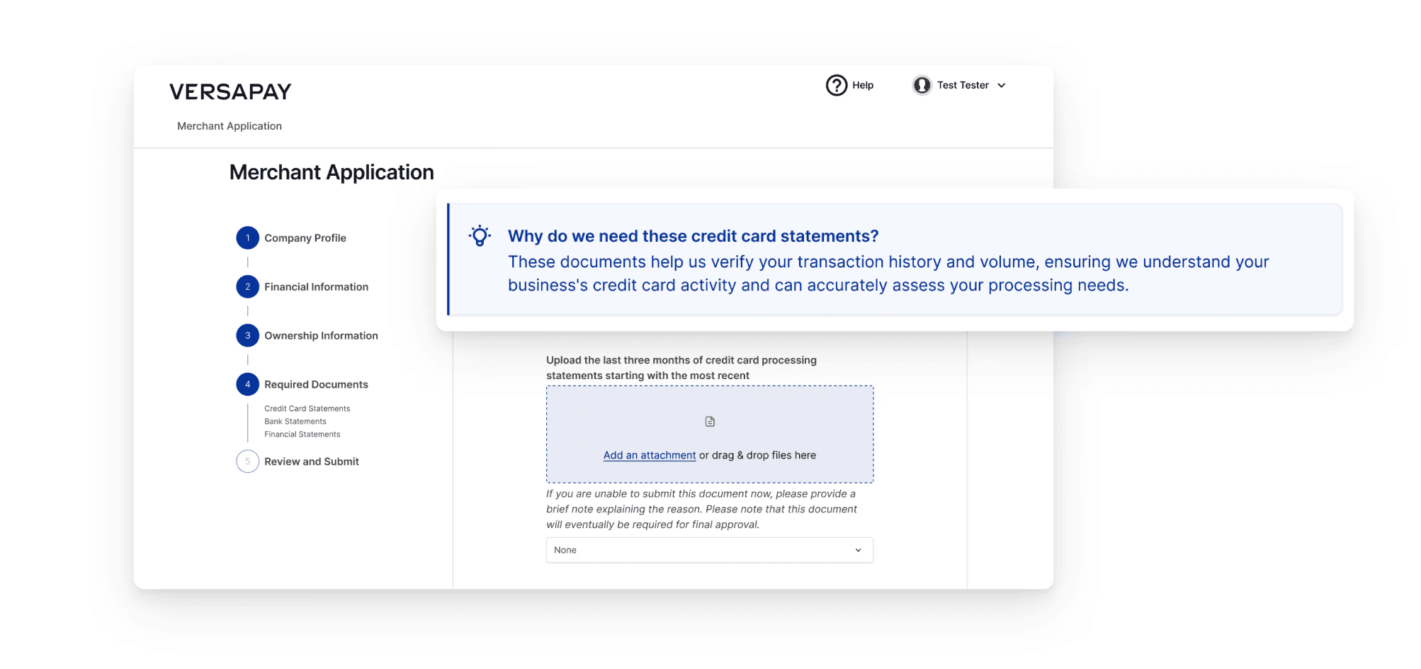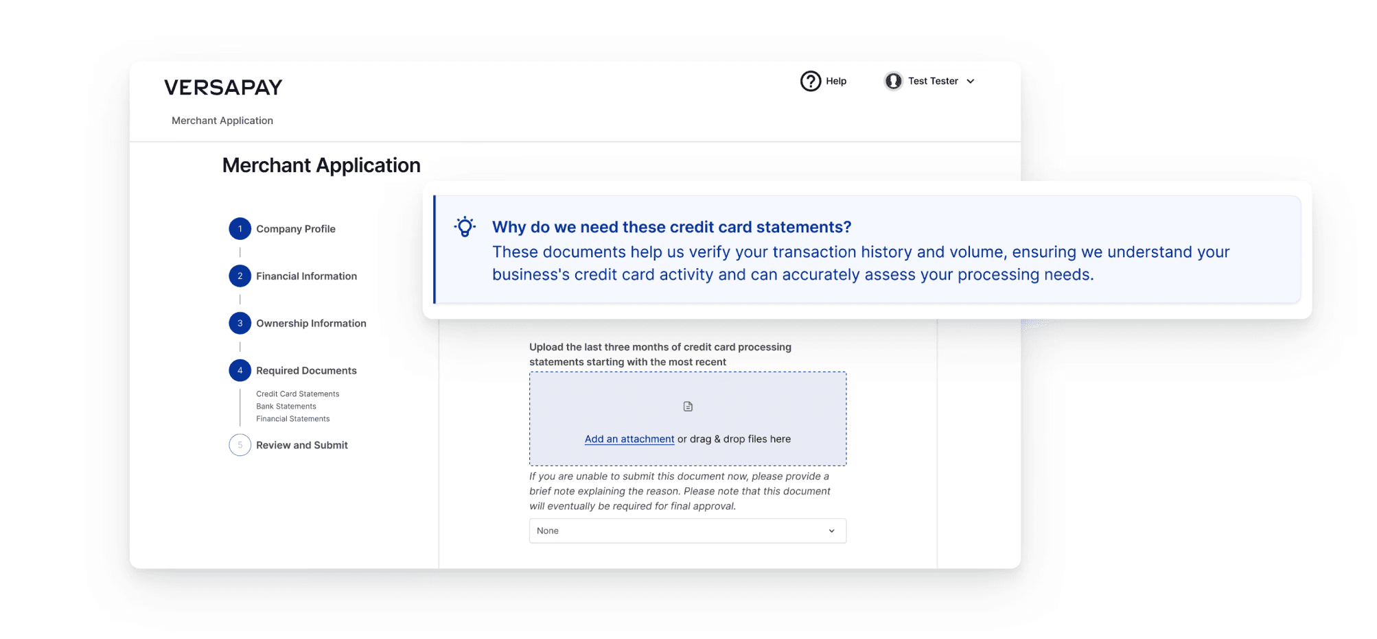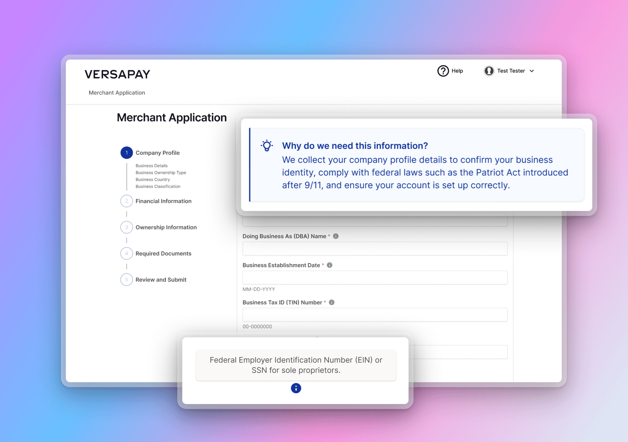 We introduced plain-language tooltips and blurbs above fields (e.g., defining jargon like “NAICS code”) and explaining why we needed specific business details (e.g., Patriot Act fraud prevention). Merchants finally had context, not just fields.