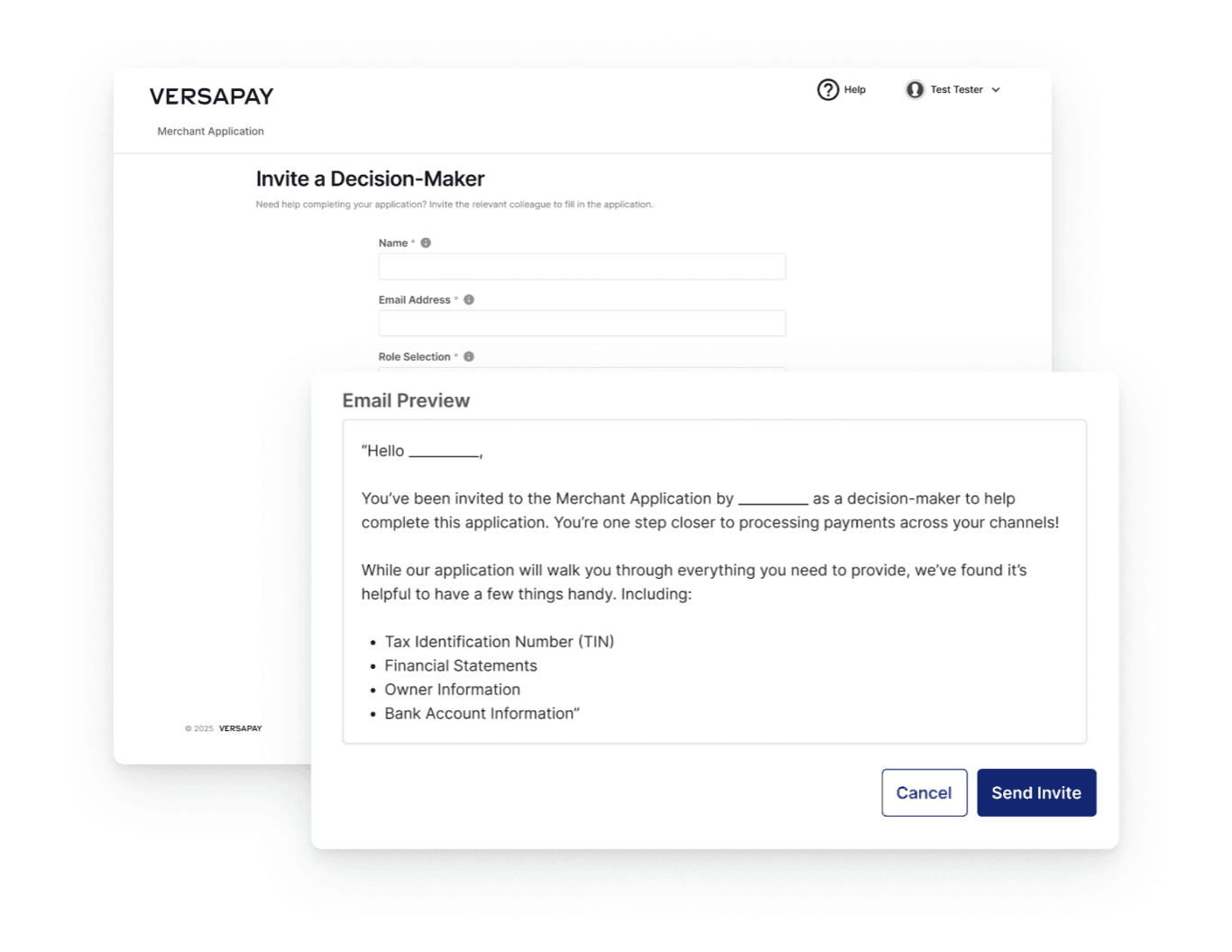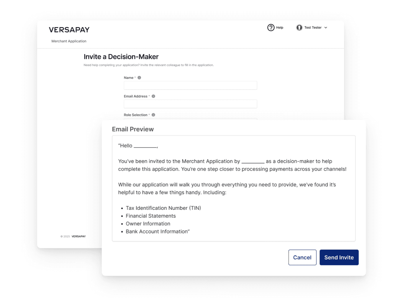 Onboarding often requires multiple people. We added the ability for merchants to invite decision makers, like legal or finance colleagues, to upload required documents. This transformed onboarding into a collaborative process, cutting down delays.