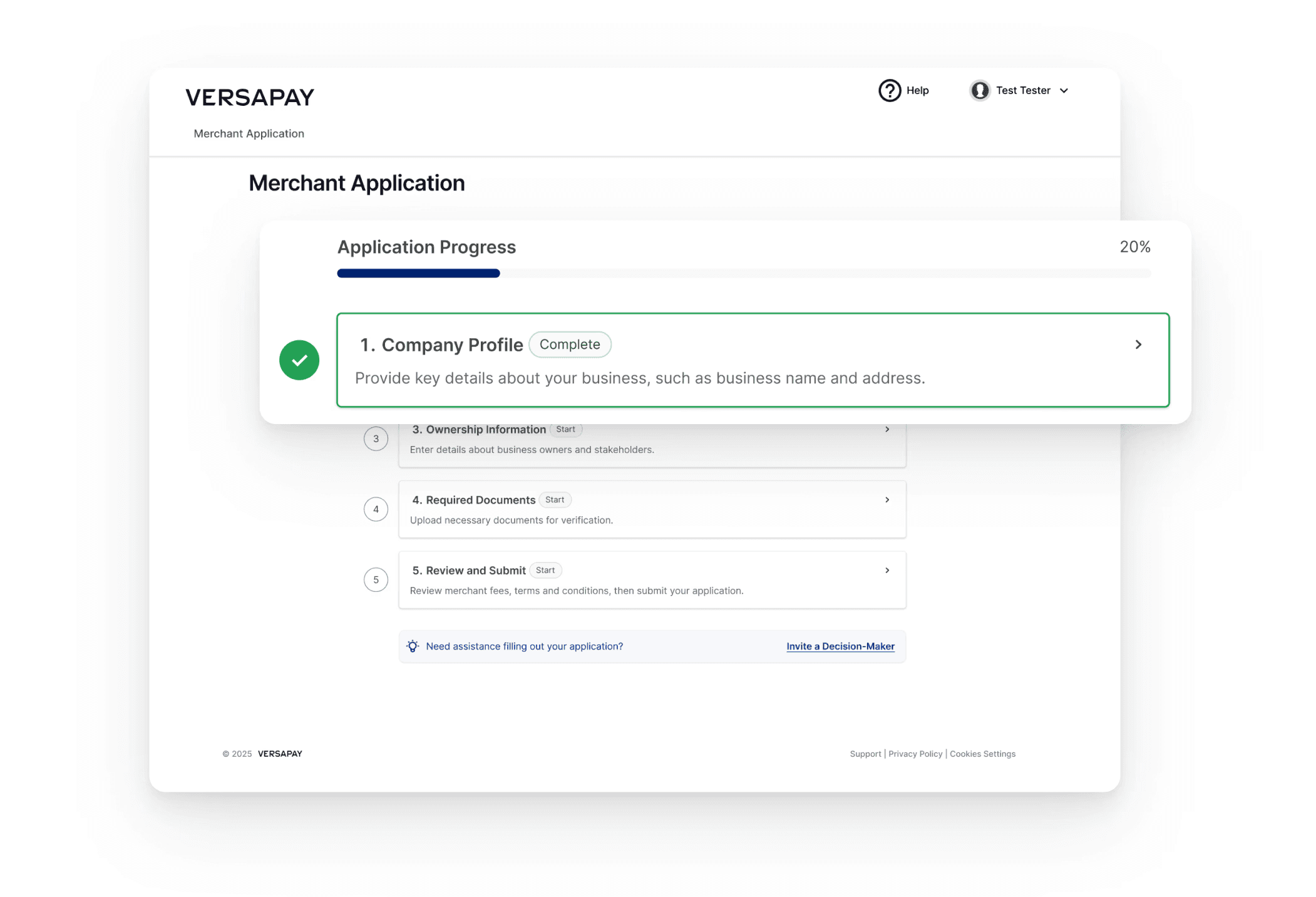 Instead of overwhelming merchants with an endless form, I designed a 5-section guided process. Each section was short, categorized, and easy to follow, allowing merchants to complete the application in logical, digestible steps.